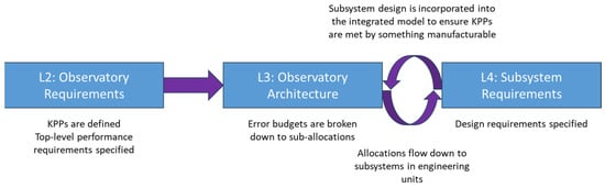 The KPPs are defined in the ORD and are the engineering requirements that would have the most significant impact to science if they were not met. Many of the Level 2 KPPs link to several of the science requirements. Every Level 2 requirement also has an associated performance budget in the Level 3 Observatory Architecture Document (OAD). Figure 1 indicates the current best estimate (CBE) analysis: allocations from the error budgets, including the KPP budgets, are flowed down in engineering units to the Level 4 subsystem requirements documents.