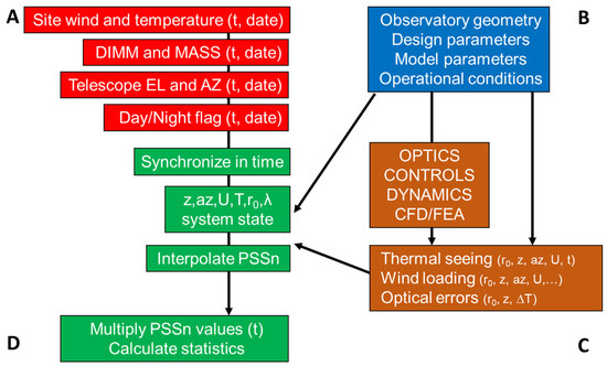 The essence of the performance framework is depicted in Figure 2. Group A (red) denotes the available inputs. Group B (blue) is what can be controlled by design and operation. Group C (brown) shows the developed integrated modeling framework output with the pre-calculated aberrations in LUT form (the optics/controls/dynamics/CFD/FEA box is actually the integrated modeling framework). Finally, functions in Group D (green) correspond to mathematical/statistical processing and are in fact the core of the time domain simulation.