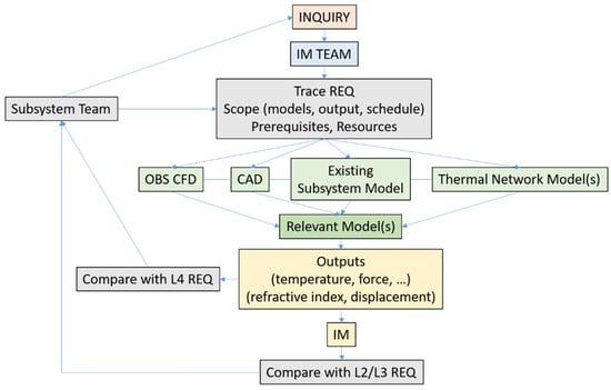 The subsystem team contacts the IM team with an inquiry (Figure 4). Typical inquiries can be design trade-off studies (geometric considerations, equipment selection, flow rate and heat dissipation options), input data for survival analysis, and the performance impact of irreversible design choices. These can often be review action items. A meeting or a series of meetings between the teams are held to trace the subsystem requirements directly involved (Level 4) and the corresponding performance requirements (typically Level 3). This is important to define the scope of the action expected by the IM team: what models are required, with what output, and by when. Once the scope is defined, all prerequisites can be identified and required resources estimated.