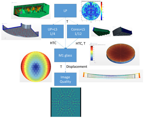 It is not practical for a single, unified model to run through all time frames relevant to an ELT’s performance, from milliseconds to years. Therefore, our approach is to separate physical processes into distinct mathematical models that can be explored somewhat independently. Using the Point Source Sensitivity-Normalized (PSSn) metric [10,11,12] as an example KPP, individual results can be combined to system-level estimates. There are noted exceptions to this approach. In some cases, the time frames of coupled processes overlap sufficiently to justify the development of integrated models. A particular case involves wind, telescope structural dynamics, and control dynamics. For ELTs, this is thoroughly investigated, including the wind buffeting of the primary mirror and the close interaction between the control and structure. Similarly, image jitter due to telescope vibrations is directly addressed in adaptive optics simulations. Over longer time frames, solid (glass and steel) and aerothermal processes are closely coupled. Addressing this coupling requires iterations between the CFD and FEA models or the development of high-resolution conjugate heat transfer models.
