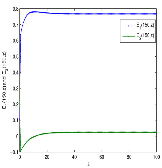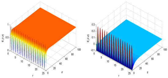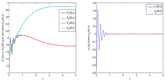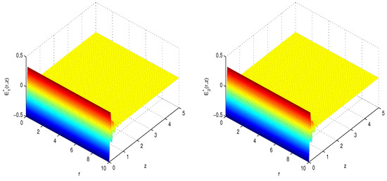 with the domain and . The initial conditions for the master–slave systems (9) and (24) are established as follows: We aim to formulate two controllers, denoted as and , as described below:we have and The time of synchronization is estimated as:andwhere . We can conclude that Figure 5, Figure 6 and Figure 7 showcase the spatiotemporal dynamics of systems (9) and (24), providing insights into both two-dimensional and one-dimensional spaces. To furnish numerical evidence, we present the spatiotemporal solutions of the error synchronization system (30) in Figure 7 and Figure 8. This evolution clearly demonstrates that the errors converge to zero as approaches , thereby illustrating the finite-time behavior of the system. Furthermore, Figure 9 exemplifies this finite-time convergence within the specified duration . 7. Conclusions
