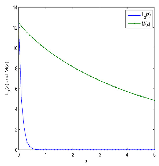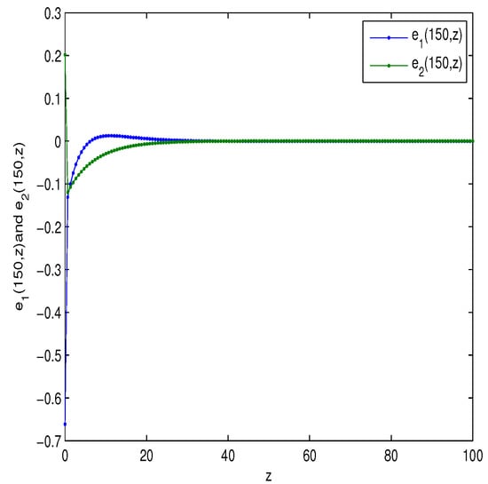 with initial conditions: The conditions of Theorem 3 are met: Upon calculation, we obtain: The time of finite-time stability of the equilibrium point is estimated as:where The figures presented in Figure 1 and Figure 2 depict the spatiotemporal solutions of system (9) with homogeneous Neumann boundary conditions. According to Theorem 3, these solutions exemplify finite-time stability at the equilibrium point . To validate this assertion numerically, Figure 3 showcases the system’s spatiotemporal solutions alongside the corresponding errors, focusing specifically on one-dimensional space. This visual representation compellingly illustrates that the Lyapunov function converge to zero as approaches (as depicted in Figure 4). Example 2. The parameters are specified as follows:| Parameter | Value |