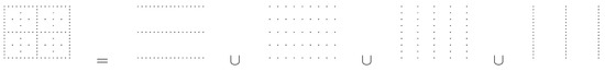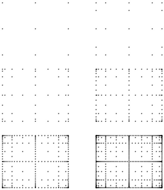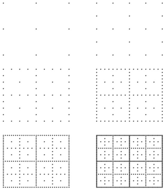 with . We refer to as the sparse grid of level in dimension d. Figure 1 shows a visual representation of the sparse grid for and . Notice that some of the grid points are included in more than one sub-grid; hence, there are some redundancies.