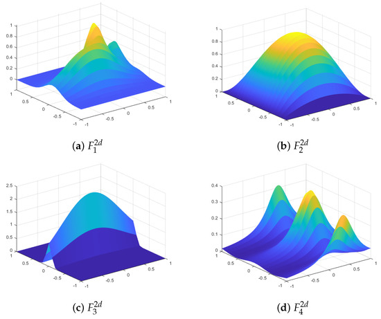 Franke’s function is very commonly used as a test function in the interpolation literature with RBF kernels [11]. The others can be found in [12,13,14], respectively. These test functions are illustrated in Figure 5.