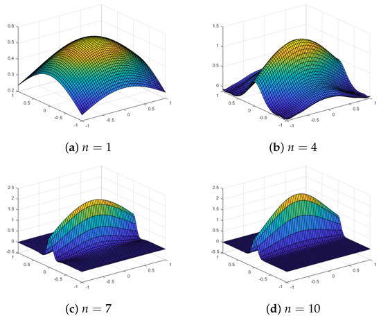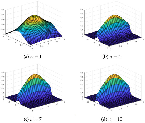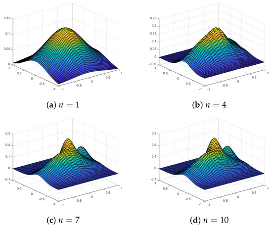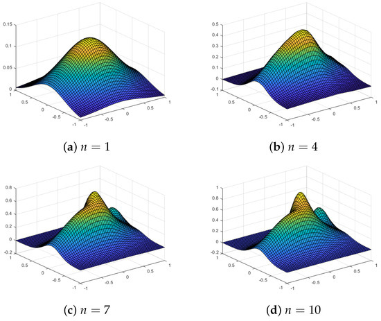 Figure 12 shows the approximations using our proposed quasi-sparse kernel-based interpolation with equally spaced grids for different values of n for the test function . Table 4 shows the error estimates. We observe that the maximum error or the RMS error does not decrease substantially as we increase the grid level n, but the plots show that approximations are very close to the true function for when we use equally spaced grids. With Chebyshev points, we observe much better approximations, with both the maximum error and the RMS error decreasing with the level n. The plots of the interpolating function evaluated at grid points for the algorithm with Chebyshev points are shown in Figure 13. For , the approximations are poor, and the overall shape is not similar to the shape of the function, but it approximates nicely as n increases.