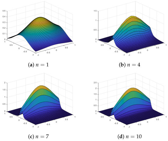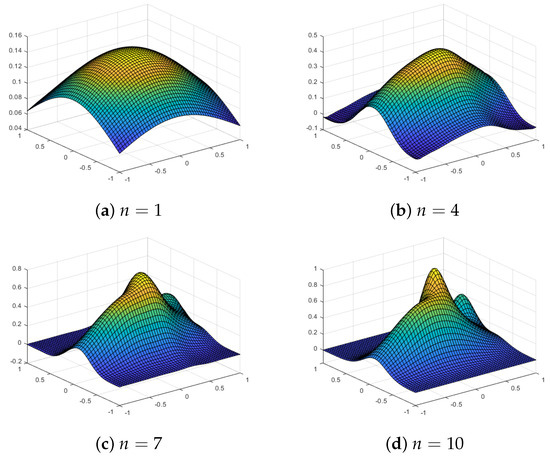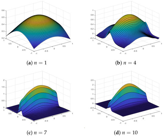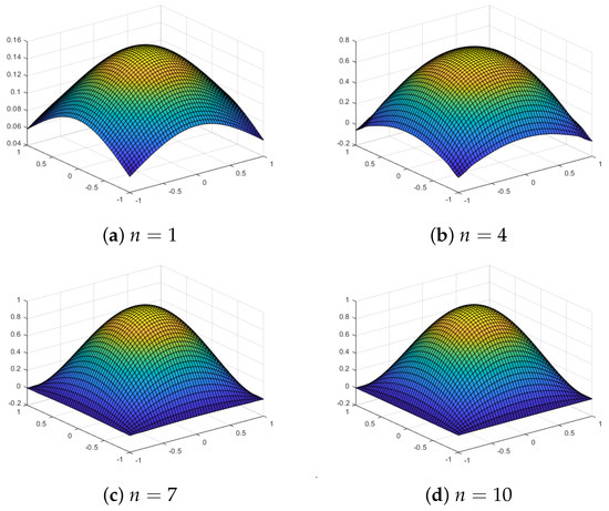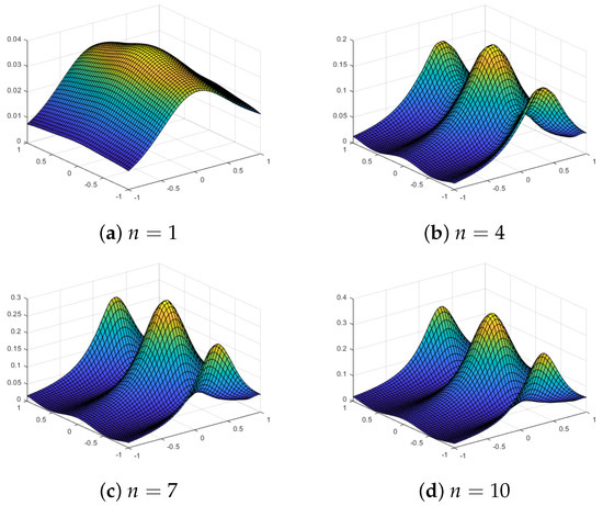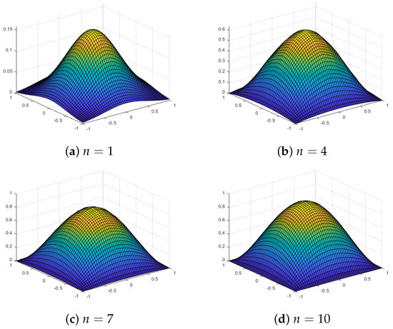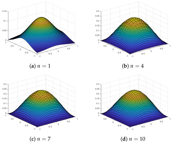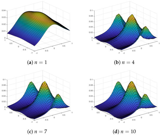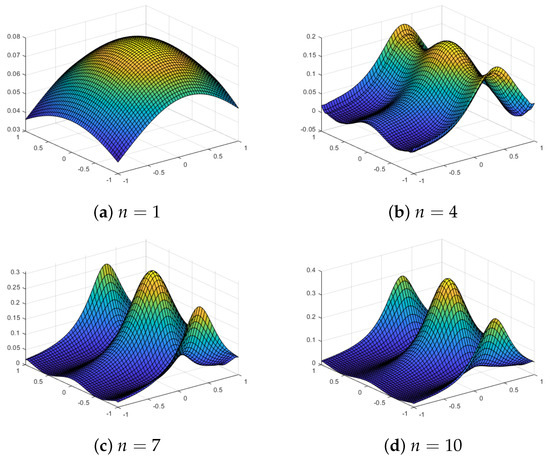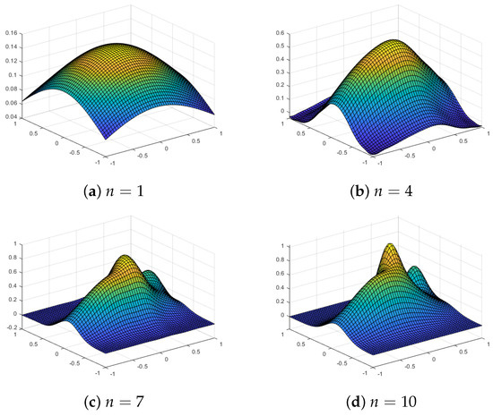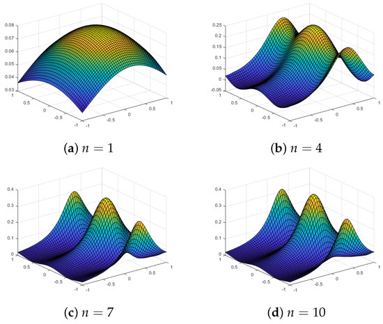 Figure 10 shows the approximations using our proposed quasi-sparse kernel-based interpolation with equally spaced grids for different values of n for the test function . Table 3 shows the error estimates. We observe that the maximum error or the RMS error does not decrease substantially as we increase the grid level n, but the plots show that approximations are very close to the true function for when we use equally spaced grids. With Chebyshev points, we observe much better approximations, with both the maximum error and the RMS error decreasing with the level n. The plots of the interpolating function evaluated at grid points for the algorithm with Chebyshev points are shown in Figure 11. For , the approximations are poor, and the overall shape is not similar to the shape of the function, but it approximates nicely as n increases. On the other hand, when there are equally spaced grids, the interpolant starts to overfit the surface and lacks smoothness for larger values of n. Thus, by increasing the number of grid levels, the approximation actually deteriorates for equally spaced grids.
