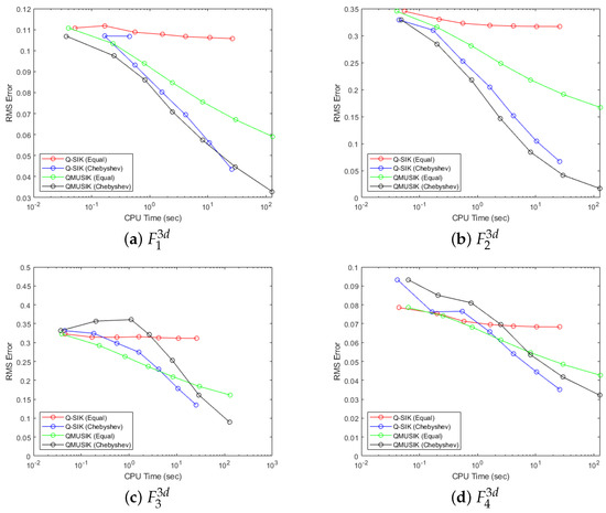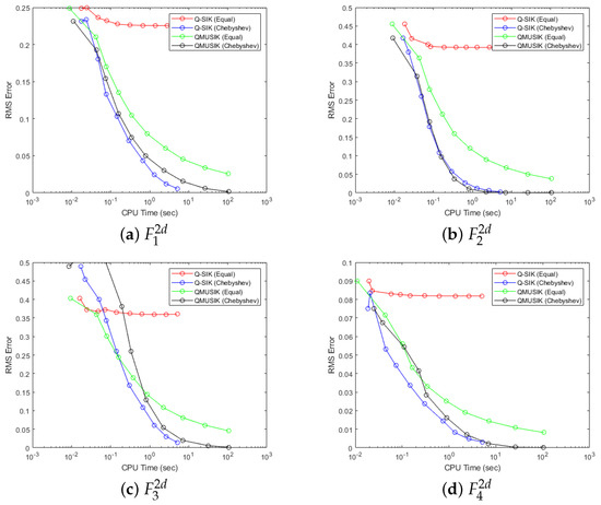 In Figure 22, the root mean square (RMS) error is plotted against the computation time for the same test functions in , and similar plots of RMS error against time for the test functions in are plotted in Figure 23. These figures show that the quasi-sparse interpolation with equally spaced grids does not converge in error as computational time increases. On the other hand, the errors decrease quite fast and converge for quasi-sparse interpolation with Chebyshev points. Multilevel quasi-sparse interpolation with an equally spaced grid improves errors in approximation and shows some convergence. Still, Chebyshev points present much better convergence results than equally spaced points. It is also interesting to note that, at a similar computational time (in seconds), quasi-sparse interpolation with Chebyshev points yields better results than the multilevel method, though multilevel methods execute only at a smaller number of levels at a comparable time.