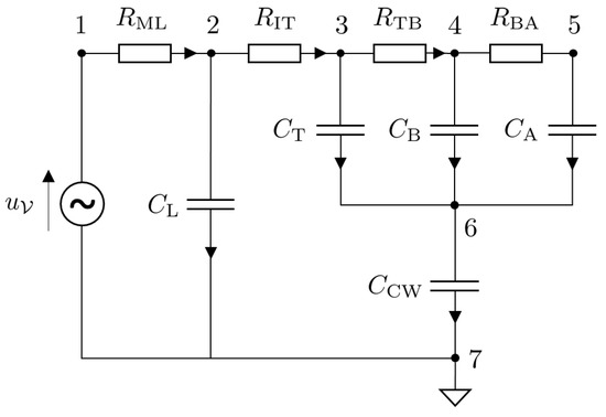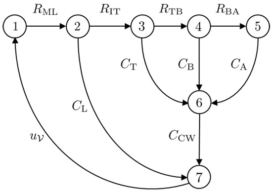 The ventilator input voltage is represented as a source . The set of sources is , and the dimension of the source is . The circuit also consists of capacitors (storage elements) that are represented as , where the index used to distinguish between the components is . Furthermore there are resistors (dissipative elements) that are represented as , where the index is given by .