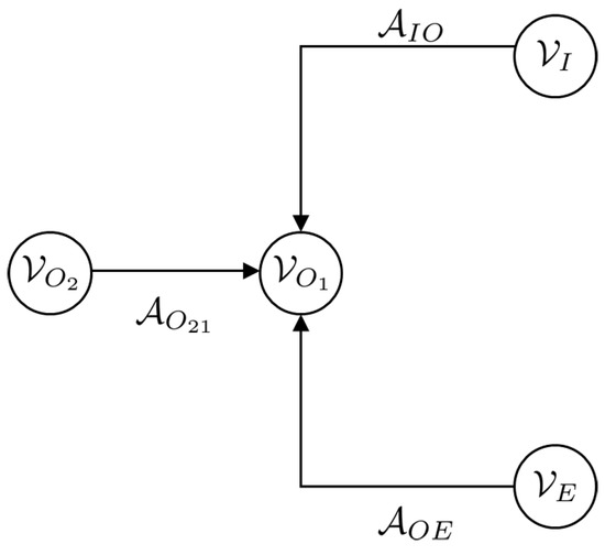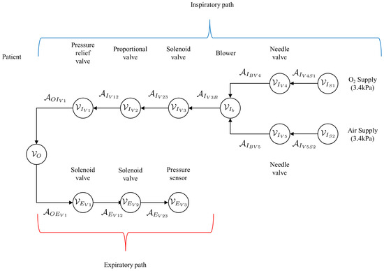 A simplified graph of the mechanical ventilator shown in Figure 2 is given in Figure 8. This simplified graph indicates the elements belonging to the patient, as well as the inspiratory arcs and vertices belonging to the mechanical ventilator. The arcs belonging to the patient are denoted by , while the vertices are denoted by . The elements of the inspiratory and expiratory arcs and vertices, given by and , respectively. A more detailed representation of the graph of the mechanical ventilator in Figure 8 is given in Figure 9.