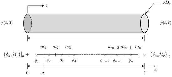 Each system state can be replaced with a discrete approximation consisting of a total on n elements, as can be seen in Figure 10. As such, , and . As such, state vector can be replaced by a discrete approximation . The element of is located at , where is the fixed discrete step size between points, and . In addition, the efforts at the boundaries are given by and . Thus, the Hamiltonian given in Equation (20) can be approximated by a discrete approximation such that so that the discrete system effort is now . A finite difference approximation of the spatial derivatives at the point is