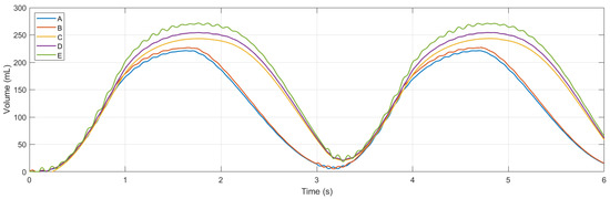 Simulations were conducted using MATLAB Version: 9.13.0.2193358 (R2022b) Update 5 on an Intel Core i5 CPU with four cores and 8 GB of RAM. Figure 11 and Figure 12 show ventilation curves for a lung under two conditions: a partially damaged lung with a compliance and resistance of 20 mL/cmH2O and 20 cmH2O-s/L, respectively, and a lung with complete damage, which is represented by a lung compliance and resistance of 10 mL/cmH2O and 50 cmH2O-s/L, respectively. The ventilation curves maintain the same sinusoidal behaviour. For the damaged lung case study, minimum ventilation values of flow over time and air volume are achieved. In the damaged lung, the compliance and resistance of the lung increase the pressure.