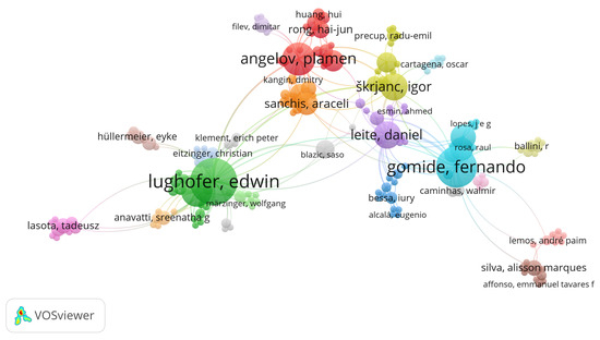 Commencing with the co-authorship analysis depicted in Figure 2, all authors are listed, with three main clusters identified as the most prominent. These clusters represent the researchers Fernando Gomide (light blue), Edwin Lughofer (green), and Plamen Angelov (red).