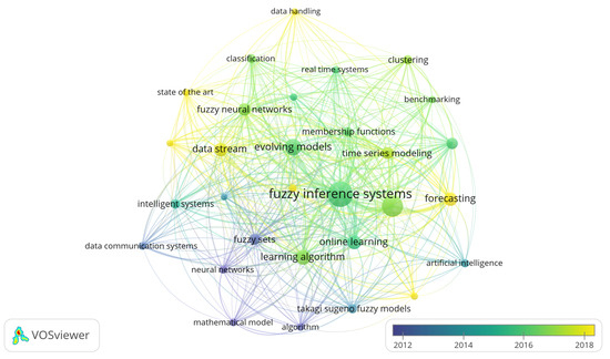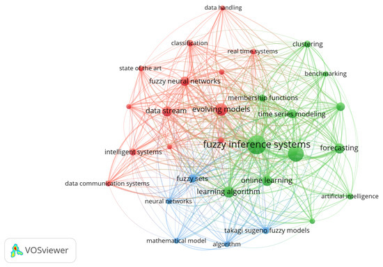 In Figure 3, the co-occurrence of keywords is examined, with the minimum occurrence threshold set at 13 repetitions to identify the most relevant topics within the scope of the review. In addition to EFSs, it is observed that there are elements related to applications such as real-time systems, data streams, and communication systems (highlighted in red). Furthermore, implementations such as mathematical modeling, Takagi–Sugeno models, and neural networks are noted (highlighted in blue), along with approaches such as prediction, classification, online learning, and artificial intelligence (highlighted in green).