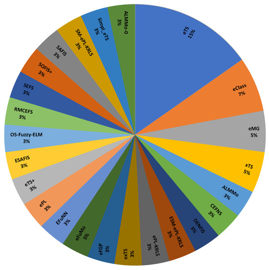 Table 2 describes the 115 evolutionary fuzzy inference system structures applicable to forecasting. Additionally, Figure 6 illustrates the usage percentages of various EFSs, considering a minimum of two applications. eTS has the highest frequency of application, followed by eClass, eMG, and xTS, in predicting the variables indicated in Table 3.