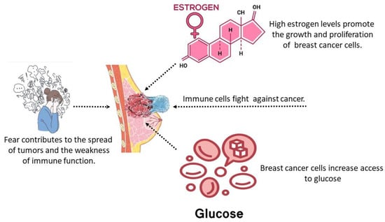 Estrogen, a female steroid hormone, is produced at low levels by the placenta in women and the testes in men. It serves several important purposes, including facilitating sexual development, controlling a woman’s menstrual cycle, and managing the physical changes associated with puberty. Therefore, it is regarded as a crucial hormone for the optimal transformation of the breast tissues. Estrogen is recognized as a risk factor that is linked to the development of breast cancer. Estrogen has a role in activating other hormones, such as relaxin, which in turn stimulates the proliferation of breast cells []. Estrogen has promoted the proliferation of tumor cells when tumor cells are present. It functions as a carcinogen by damaging DNA and converting normal epithelial cells into cancerous tumor cells [,]. The dynamics of estrogen can be described as follows:
