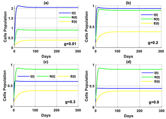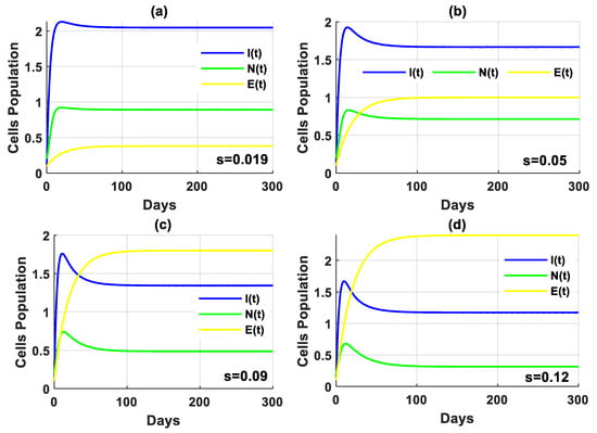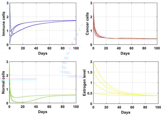 The solution of the PPIGCNE system with various values of and the initial conditions of immune cells, breast cancer cells, normal cells, and estrogen level are and .