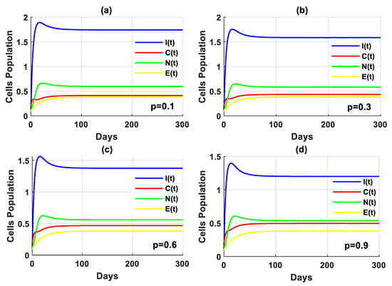The solution of the PPIGCNE system with various values of and the initial conditions of immune cells, breast cancer cells, normal cells, and estrogen level are and ng/mL.