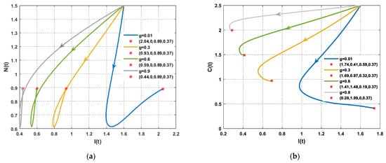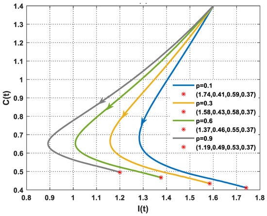 Numerical verification is essential for completing analytical studies. In this section, we visually confirmed the accuracy of our analytical findings for the PPIGCNE system using the software MATLAB R2021b [,,,,,]. The simulations were conducted using the parameter values specified in Table 1. The equilibrium values corresponding to the data given in Table 1 are and . See Figure 2.