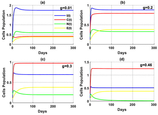 The solution of the PPIGCNE system in the absence of tumor cells with various values of and the initial conditions of immune cells, breast cancer cells, normal cells, and estrogen level are and .