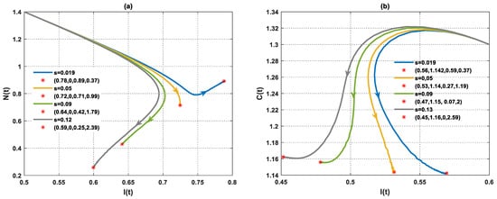 The dynamics of immune and cancer cells with various values of and the initial conditions of immune cells, breast cancer cells, normal cells, and estrogen level are and . represents the final state of the solution and the number in the bracket denotes the equilibrium point with different values of .
