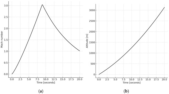 In order to determine the freestream flow conditions at the flight altitude, Equations (1) and (2) are used together with the 1976 U.S. Standard Atmosphere data [21]. Figure 1 shows the profile of both the Mach number and the altitude as a function of time: