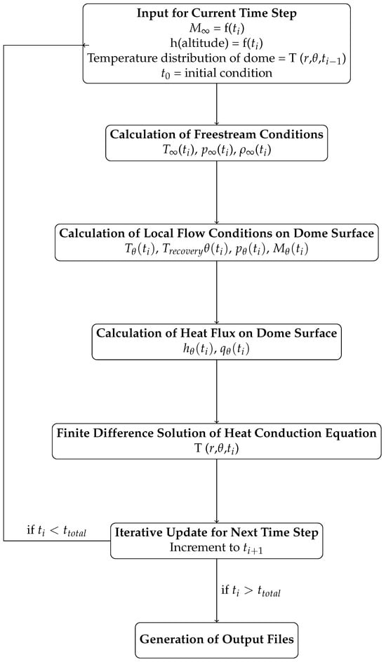 The proposed methodology’s first step is calculating the local flow and fluid properties at the outer edge of the boundary layer around the hemispherical dome. The second step is calculating the local heat transfer coefficient values by utilizing the flow properties and the correlation proposed by Beckwith and Gallagher [1]. In the third step, using local heat transfer coefficients and flow properties, the heat conduction within the shell of the hemispherical dome is solved by the finite difference method, to obtain the temperature distribution. These steps are repeated in a time-iterative manner, to simulate the full flight. The calculation procedure involves the determination of the heat transfer coefficient at the current time step by using the dome surface temperature distribution obtained from the previous time step and the flow properties calculated at the current time step. This calculation structure is summarized in Figure 2: