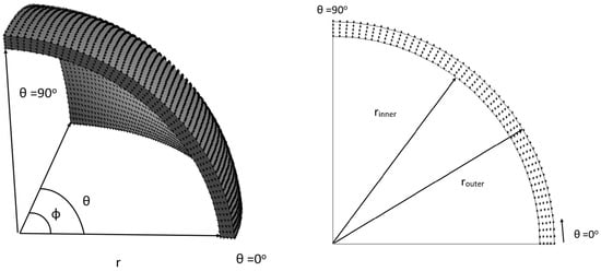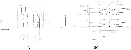 The angular position of interest is , and its depiction can be found in Figure 3. It is also important to underline that variations in the direction are disregarded, due to the model’s axisymmetrical nature used in the computations. In addition to the axisymmetry of the geometry, the flow is also assumed to be symmetrical since the dome is expected to reach its highest temperature under symmetrical flow conditions. Under these conditions, a two-dimensional heat conduction equation will be solved, together with one-dimensional flow calculations for determining the temperature distribution within the dome thickness, as illustrated in Figure 3: