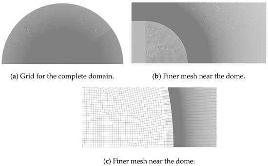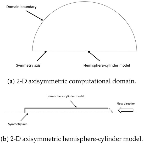 To evaluate the accuracy of the introduced method, a two-dimensional Unsteady Reynolds-Averaged Navier–Stokes (URANS) simulation was conducted. The simulation’s computational domain included both the dome section and its surrounding flow field. In this Computational Fluid Dynamics (CFD) setup, a finite-thickness cylinder with an identical radius and a length of 3 m was positioned following the hemisphere. The dome itself had a radius of 0.36 m and a thickness of 0.004 m. The flow domain and the missile geometry are presented in Figure 5. To discretize the domain for simulation, a structured mesh composed of 1.2 million elements was employed, as depicted in Figure 6. The turbulence was modeled using the k–– model. A pressure-based, coupled solver was utilized for the simulations. The simulations also accounted for conjugate heat transfer between the dome and the flow, employing second-order schemes for both spatial and temporal discretization. The dome’s wall boundaries were treated with a no-slip condition and were considered perfectly smooth. Within the dome, the buoyancy effects were disregarded, and radiative heat transfer was not accounted for in these simulations.