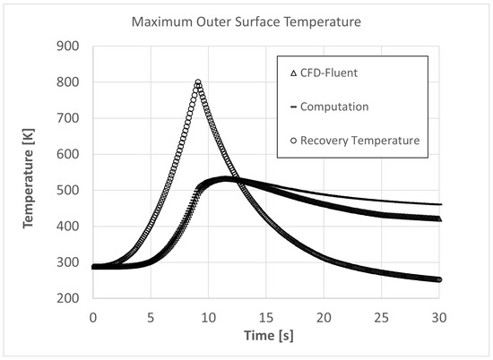 The variation of the maximum temperature at the outer surface of the hemisphere over time was plotted for the specified flight scenario, and it can be observed in Figure 7. Comparing the maximum temperature values derived from both the CFD simulations and the developed numerical approach alongside the variation of the recovery temperature reveals that there is a quite reasonable correlation between the outcomes of the proposed method and the CFD simulations throughout the heating phase. This phase was identified as the initial 13 s of flight, during which the recovery temperature exceeded the maximum outer temperature of the dome. However, a discrepancy in the results from the proposed method and the CFD simulations became apparent during the cooling phase, when the recovery temperature fell below the maximum outer temperature of the dome. This suggests that the heat flux estimations made by the numerical approach were slightly lower than those from the CFD simulations, particularly in the cooling phase, when the velocity of the flow is reduced due to deceleration.