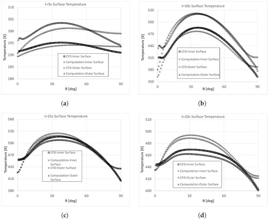 The subsequent aspect of the comparative analysis focused on the temperature distributions across the outer and inner surfaces of the dome, as showcased in Figure 8. Here, the temperature profiles on the dome’s outer and inner surfaces at 5, 10, 15, and 20 s of the flight are demonstrated. Echoing the trends observed in the maximum temperature graph in Figure 7, the temperature profiles derived from both the numerical and CFD simulations show significant alignment up to the 15 s mark, with discrepancies becoming more evident at 20 s. A notable similarity in these findings is the temperature difference between areas near the stagnation point and the shoulder area () of the dome. The heat flux on the outer boundary was estimated utilizing an adapted correlation from turbulent flat plate flow. This method tended to underestimate temperatures at the stagnation point by up to 15% compared to the results obtained from the CFD simulations. Discrepancies observed near the dome’s shoulder in the numerical findings versus the CFD simulations are also noteworthy. The proposed method tended to overestimate temperature values in this region, as it was based on modified Newtonian theory, which is incapable of capturing flow separation effects. The separation that may occur in regions close to the shoulder cannot be modeled accurately with the current approach. Therefore, the temperature values estimated by the proposed method were higher than the temperature values obtained from CFD simulations.