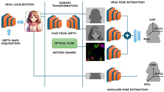 The algorithm comprises two modules: multiclass facial segmentation and head pose estimation. The authors highlight the informativeness of this segmentation in head pose estimation. In their paper [19], Xiang Xu et al. investigate global and localized features obtained by convolutional neural networks. These features are used to learn to estimate both head position and landmark localization. The authors demonstrate that the developed algorithm, named JFA (joint head pose estimation and face alignment algorithm), improves head pose estimation compared to SVR, Random Forest model, and G-Net neural network. In [20], authors Heng Song et al. demonstrate that their multi-task deep learning method, which combines face recognition and pose estimation, is more efficient than classical two-stage methods (face recognition followed by estimating head rotation). The accuracy of the orientation angle estimation of their one-stage algorithm is 1.96 degrees (MAE). In [21], a 3D head pose estimation system was developed based on a deep learning face analysis model. A face-part segmentation system was developed using deep convolutional neural networks (DCNNs). The MAE of head angle detection for different datasets varies from 4.3 to 2.02 degrees. The paper [22] presents a comprehensive system for head and shoulder pose estimation based on depth images alone (Figure 5). The core component of the developed framework is a convolutional neural network, which accepts three types of images as input and generates a 3D object position as output.
