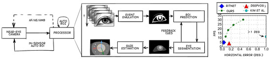 - Feng, Y.; Goulding-Hotta, N.; Khan, A.; Reyserhove, H.; Zhu, Y. Real-Time Gaze Tracking with Event-Driven Eye Segmentation. In Proceedings of the 2022 IEEE Conference on Virtual Reality and 3D User Interfaces (VR), Christchurch, New Zealand, 12–16 March 2022; University of Rochester: Rochester, NY, USA, 2022. [Google Scholar]