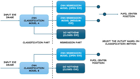 In [53], a real-time gaze tracking system based on active IR illumination is described. This system is used in an interactive graphical display. The system can perform robust and accurate gaze estimation without calibration and with quite significant head movement. The authors introduce a novel gaze calibration method that identifies the mapping of pupil parameters to screen coordinates using generalized regression neural networks (GRNNs). The gaze angle accuracy is approximately 5 degrees horizontally and 10 degrees vertically. In [54], authors Bin Li et al. present a method for estimating eye location from facial images. A set of convolutional neural networks is used to determine the most probable eye region and classify the region as the left or right eye. Initially, the most probable eye location regions are determined, then a first set of convolutional networks detects the correct position of the eyes in the frame and outputs their outline, and a second set of convolutional networks marks the location of the pupils. The presented method is reported to be faster and adaptable to image variations, including changes in ambient lighting, facial occlusions, and changes in image modality. In a study published by Warapon Chinsatit et al. [55], a convolutional neural network-based method for pupil center detection was presented for a wearable gaze estimation system using infrared eye images. The proposed method (Figure 9) employs two CNN models. The first CNN model is used to classify the eye state, while the second is utilized for the detection of pupil center coordinates. The classification model discards images with closed eyes, while the estimation model performs gaze parameter computation only when the input image shows an open eye. The proposed method exhibits high accuracy and has the potential for application in gaze estimation based on wearable devices.