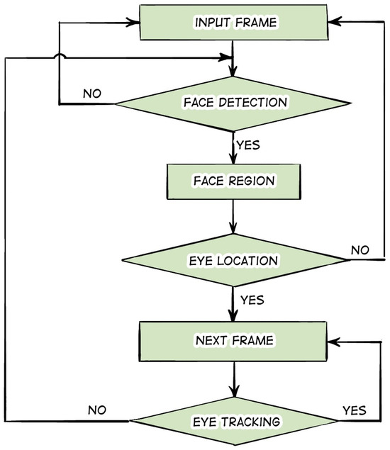 Let us consider the sources that utilize deep learning. The paper by Braiden Brousseau et al. [50] describes a low-cost remote gaze tracking system that utilizes a smartphone with a built-in infrared illuminator and camera. The developed system employs a three-dimensional gaze estimation model that enables the precise estimation of the point of gaze (PoG) when the head and instruments are unrestricted in their movements. To accurately locate the center of pupil and corneal reflections, the system uses convolutional neural networks along with a new center-of-mass output layer, which increases the system’s robustness to significant changes in the appearance of eye images found in handheld tracking systems. The hybrid approach, which uses artificial illumination, a three-dimensional gaze estimation model, and CNN-based feature extraction, achieved significantly higher accuracy (400%) than existing smartphone eye-tracking systems that employ natural illumination and machine learning techniques for estimation. In the work of Nachiappan Valliappan et al. [51], a three-layer convolutional neural network was used to estimate the position of the patient’s pupils. An RGB (red, green, blue) image from the front camera of a smartphone was fed to the input of the network. It was reported that the average pupil detection error across 26 patients was approximately 0.5 cm, which was comparable to that of the expensive Tobii Pro 2 instrument. The paper also notes that the accuracy of pupil position detection varies depending on the location of the eyes within the frame. Yu Feng et al. [52] present a gaze detection algorithm based on deep neural networks (DNN). The algorithm’s design is illustrated in Figure 8. The authors claim that their model is capable of detecting pupil position with an error of 0.5 degrees and that the frame rate can be maintained at around 30 Hz.