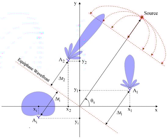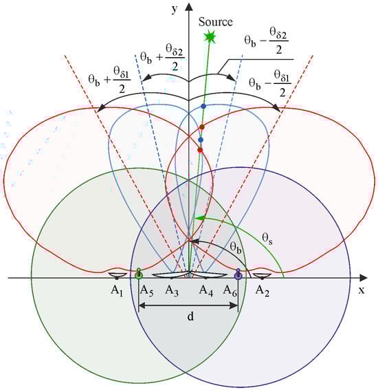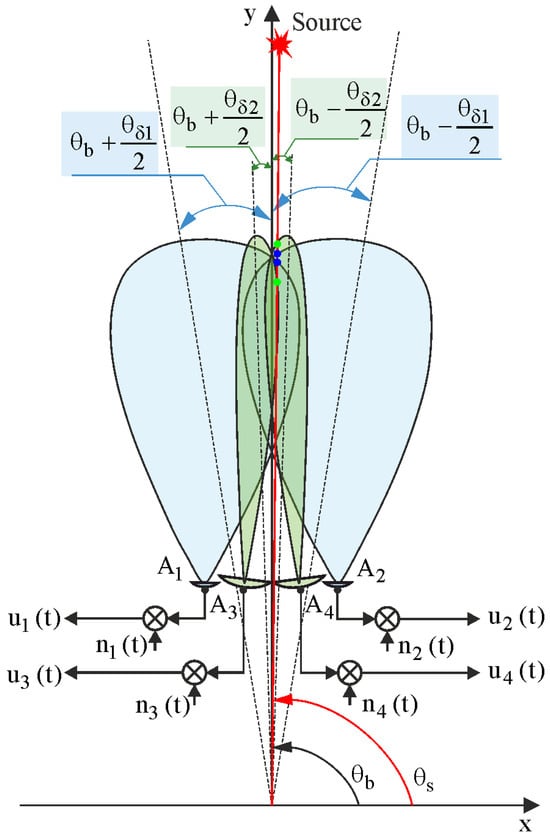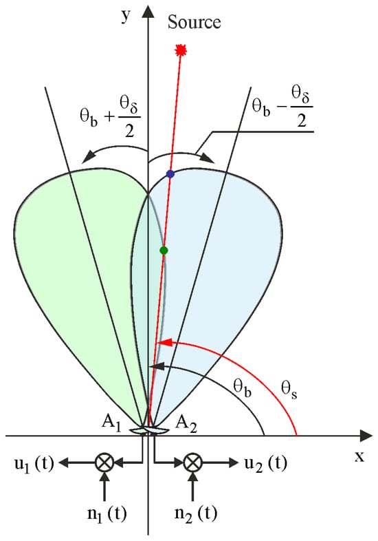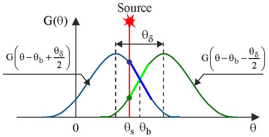 Let us assume the signals from the radiation source are received by two identical antennas separated by an angular distance in their radiation patterns, The direction where equal signal values are observed in both receiving channels is called the equal-signal direction and is denoted by . A typical geometry for measuring angle in a two-antenna direction finder is shown in Figure 2. When determining the orientation angle of the antenna pattern’s maximum in (1), it is noted that , .