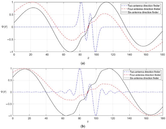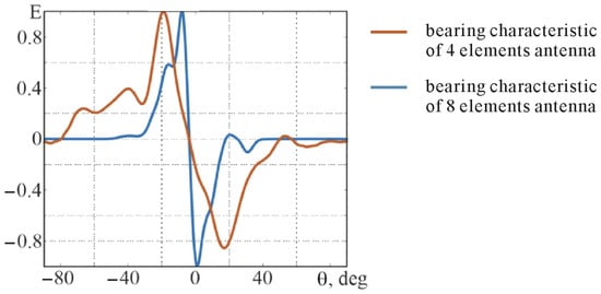 The bearing characteristics for the given parameters when using antennas with the diagrams from Equation (31) are shown in Figure 6b.