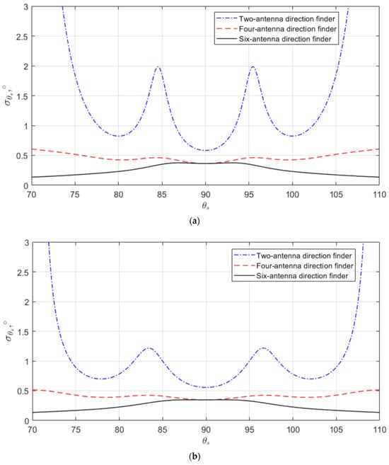 It is useful to model the obtained expressions using the same parameters as those for the bearing characteristics shown in Figure 6. The results of such modeling are presented in Figure 7. The figures illustrate the root mean square (RMS) errors in estimating the angular position of the radio source in degrees as a function of the observation angle for the two types of directional patterns, (30) and (31). The chosen angles from 70° to 110° correspond to the widest range of unambiguous measurements in the six-antenna direction finder.