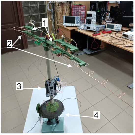 Simulation modeling was conducted under idealized conditions, with a directional pattern free of side lobes and a receiving path devoid of internal noise. Consequently, before interpreting the results, it is advisable to perform experimental validation of the proposed signal processing algorithm within the direction-finding system. To achieve this, the system depicted in Figure 8 was developed, based on the method (22). This system comprises four receiving antennas with RF paths calibrated to the frequency range of 2.4–2.48 GHz, a microprocessor-based data acquisition unit, and an automatic rotary device.