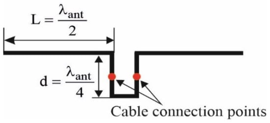 Collinear antenna arrays were selected due to their straightforward implementation and tuning, lack of need for complex calculations, and easily adjustable pattern width by varying the number of sections in the antenna. The geometric relationships of the antenna elements relative to the wavelength used in the calculations are shown in Figure 9. In the antennas used during the experiment, L = 54 mm and d = 22 mm. The connection point for the 50-ohm impedance cable on the center loop was determined experimentally. The antenna with a wide radiation pattern consists of four receiving elements, while the one with a narrow radiation pattern consists of eight.