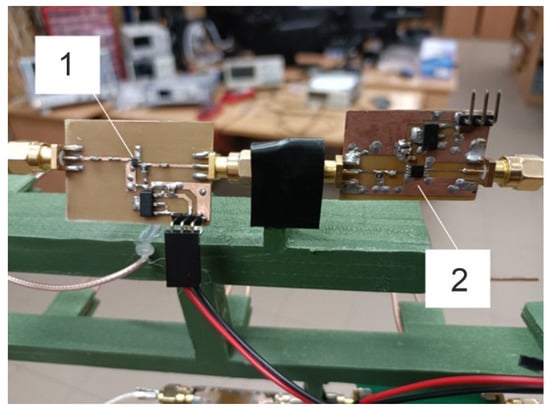 The outputs of the antennas are connected to RF paths, one of which is depicted in Figure 10. This path includes a low-noise amplifier based on the MGA-86563 chip and an AD8361 power detector. The measured gain of the path is 19.5 dB, with parameter variations between different implementations not exceeding 0.3 dB.