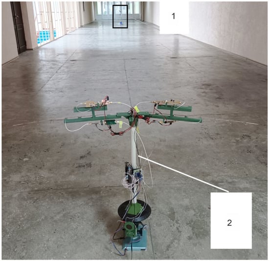 In the experiment, the transmitter and direction finder were positioned 20 m apart, as shown in Figure 12.