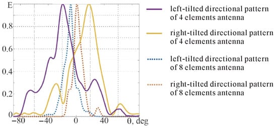 From the obtained graphs, it was determined that the pattern width of the eight-element antennas is 17°, while that of the four-element antennas is 37°. The patterns of all antennas intersect at the 0.5 level at an angle of −3°. The offset of the intersection point from zero is not critical and will only result in a shift of the bearing characteristic zero. Figure 13 also shows that the radiation patterns of the various antennas are not symmetrical and have side lobes at the 0.5 level. This is due to manufacturing inaccuracies and mismatched coordination of individual antenna elements. However, for initial tests, such deviations are acceptable.