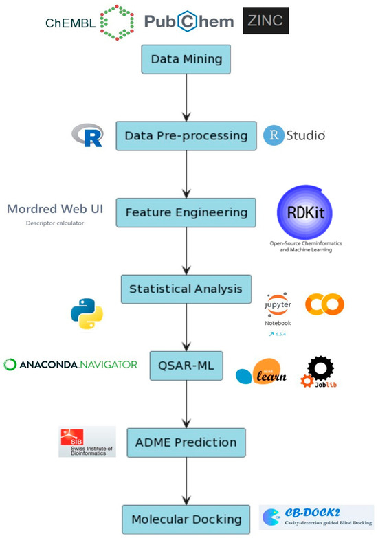 Outline of the entire methods section as well as the programs and web servers used in the following study. Data mining (EBI-ChEMBL, PubChem and ZINC15 databases) and pre-processing (R language in RStudio IDE). Feature engineering, statistical analysis and QSAR-ML performed in all in Python scripting using Jupyter notebook and Google Colab alongside modules from Mordred, RDKit, scikit-learn and Joblib. ADME prediction for generating the bioavailability radar and BOILED-EGG representation of the compounds. Molecular docking carried out using CB-Dock2 for cavity detection and protein–ligand docking scoring calculation.