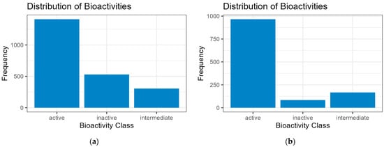 Bioactivity distributions. (a) HCV (NS5B polymerase, NS3, and NS3/4A proteases) set; (b) ROCK1 set. The frequency distribution shows the number of each inhibitor compound considered in three classes as either “active” (pIC50 > 5.4), “intermediate” (5.00 < pIC50 > 5.39), or “inactive” (pIC50 < 4.99). The screening process for bioactivity distribution is detailed in the Supplementary Material (Supplement S1: Code Repository and Dataset Repository).