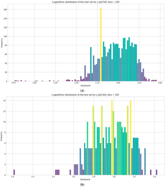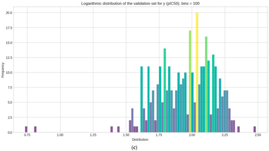 Logarithmic transformation is performed separately on y for each (train–test–validation) for the data to conform to normality [59]. The mean, median, skewness, and kurtosis are determined in Table 1. Figure 3 represents the distribution of each set in a histogram plot, bins (n = 100). Statistical measurements of each sets show how pIC50 (y) values are distributed across 100 bins in the histogram plot.