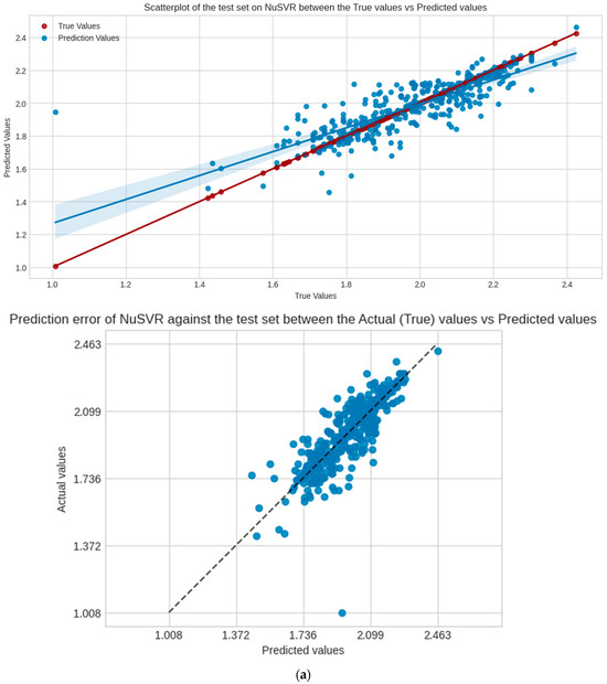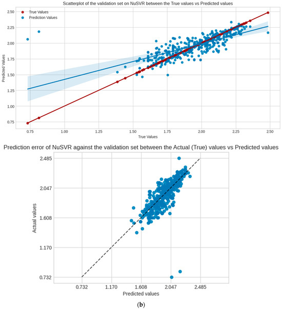 Scatter and prediction error plots of NuSVR between the actual (true values of y) vs. predicted values of y in each dataset, not accounting for the training. (a) Test set; (b) validation set.