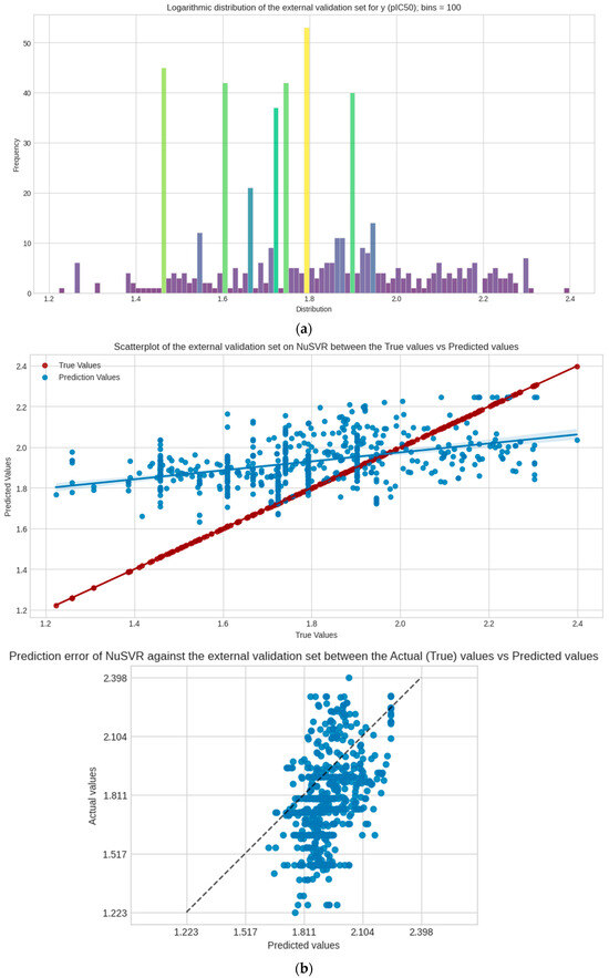 NuSVR, as the chosen model, is a type of support vector machine for regression. This ML algorithm focuses on controlling the margin of errors by using support vectors. These support vectors are data points that have the most impact in determining the most optimal regression line. NuSVR uses the parameter nu to control the number of these support vectors, where nu is an upper bound on the fraction of training errors and a lower bound on the fraction of support vectors [26,43,46,48,49]. When the external dataset is compared with the HCV-ROCK1 set, the distribution of y in the following dataset is more skewed to the right, as indicated in its positive skewness value, and a negative kurtosis value indicates that this external dataset expresses a lighter tail and a flatter distribution, which is considered a platykurtic distribution; see Table 1. The R2 performance for this dataset displayed a negative score of −0.21870. This is slightly expected as support vector machines like NuSVR are non-linear regression models; this outcome arises when the predictions made on this set, compared to the actual outcome, have not been derived from model fitting using these data. This negative case may still arise since NuSVR uses a non-linear function in its algorithm. The chosen model still poses a great challenge for generalizability in using external datasets, including the following: ensuring all parameters are accounted for, such as tuning to the most optimized hyperparameters for support vector machines; the size of the training data; the compatibility of the chosen model and its decision space algorithm with the external dataset; and possibility that the response variable (pIC50) is only loosely associated with the features (e.g., molecular descriptors and fingerprints). Since the study has limited computational resources in its capabilities, these challenges are met whenever any ML model requires good transferability to other datasets.