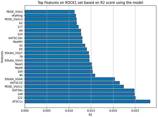 The model inspection technique of permutation importance calculates the feature importance of estimators for the dataset, in this case using only on the ROCK1 dataset. Five repeats are performed to randomly shuffle each feature and return a sample of its importance. It measures the contribution of each feature to the model’s statistical performance (R2). This involves randomly permuting/shuffling the values of each of the features and the degradation of the score is then observed. Figure 6 shows the 25 features the model majorly depends on for it to have a good R2 score. Table 4 summarizes these features, their details, and the score of impact it has on the model’s R2 [16,35]. The features described in the table are the criteria for compound selection to effectively screen ROCK1 inhibitors for their impact based on the bioactivity pIC50. The molecular fingerprint (MACCS keys) is an indication of the structural information of the compounds for drug screening/discovery selections.