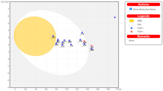 Prediction of the individual ADME (absorption, distribution, metabolism, and excretion) results of the compounds of interest is performed as an intermediary stage before the docking process. Calculation of these properties is performed in SwissADME and enables the visualization of a molecule’s drug likeliness [52]. Figure 7 reports each of the compounds that may or may not have passed the bioavailability radar, which is represented as the pink area for the optimal range in each property. The BOILED-Egg model in Figure 7 is a graphical representation for predictions for passive human gastrointestinal absorption (HIA) and blood–brain barrier (BBB) permeation. The egg whites (white-spaced region) in the model are the physicochemical space of molecules that has the highest probability of being absorbed in the GI tract, while the egg yolk (yellow-spaced region) is the space with the highest probability of molecules permeating the brain. Neither space is mutually exclusive [60]. A complete visual representation of the bioavailability radar for all of the compounds can be found in the Supplementary Material (Figure S1: Bioavailability Radar).