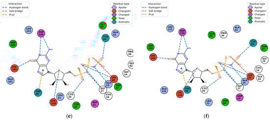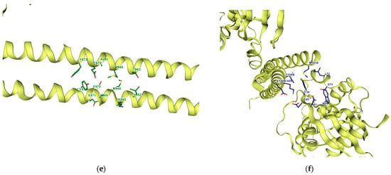 Protein–ligand contact residues and bonds are in PlayMolecule’s Plexview. Only the docked complexes at the C2 site are represented, (a) (Velpatasvir)1S1C-ZINC000203686879; (b) 1S1C-ZINC000071318464; (c) 1S1C-ZINC000073170040; (d) 1S1C-ZINC000058568630; (e) 1S1C-ZINC000058591055; (f) 1S1C-ZINC000058574949.